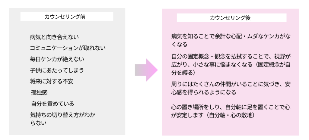 その後、この経験を生かしたいとカウンセラーの資格を取得し今に至りますが、その当時実践していた事が的を得ていたことがわかり自信に繋がりました。